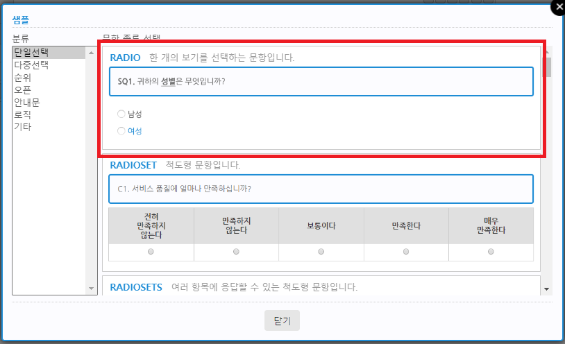 문항유형은 대표적인 유형과 해당유형의 값이 어떻게 저장되는지에 대해서만 간단히 설명하겠습니다.